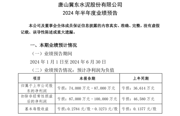 7月5日晚間,冀東水泥發布公告稱,2024年上半年預計虧損7.4億元至8.7億元,上年同期虧損3.66億元。