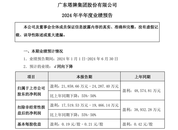 7月8日晚間,塔牌集團發布業績預告,預計2024年上半年凈利潤2.19億元-2.43億元,同比下降55%-50%。