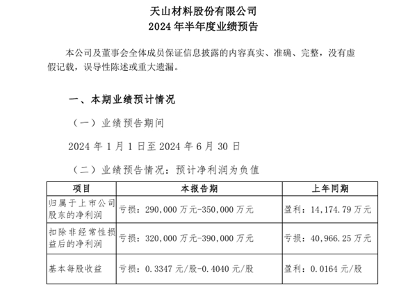 7月8日晚,天山股份發布公告稱,預計上半年歸母凈利潤虧損29億元至35億元,而去年同期盈利1.42億元。
