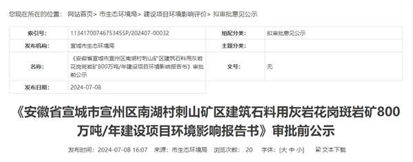 7月8日,安徽省宣城市生態(tài)環(huán)境局發(fā)布宣州區(qū)南湖村刺山礦區(qū)建筑石料用灰?guī)r花崗斑巖礦800萬噸/年建設(shè)項(xiàng)目環(huán)評批前公示。