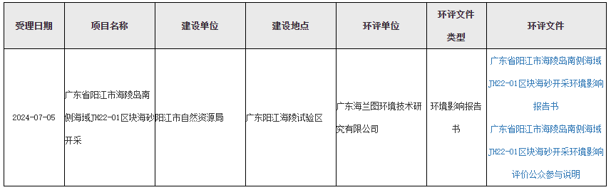 據了解,兩宗海砂礦權建設符合國家產業政策,選址符合相關規劃要求。在采砂單位切實執行國家有關法律法規、嚴格按照本報告書提出的開采范圍、方式、時間和強度作業,并注意監測附近海底地形地貌變化,避免超界、超量、超強度開采,落實報告書中提出的各項污染防治、生態保護對策措施及風險防范措施的前提下,從環境保護角度考慮,廣東省陽江市海陵島南側海域JH21-06區塊、JH22-01海砂開采是可行的。