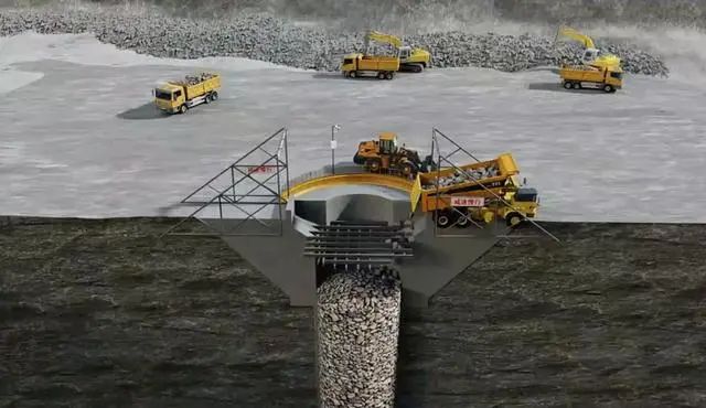 “溜井平硐”通俗地說,就是從山頂打一口直徑8米、井深212米的豎井,開采出來的石料直接填入井中,當豎井快被填滿時,井底的石料破碎機開始運轉分解大塊礦石,在這樣“滿井運行”的狀態下能夠很大程度緩解石料垂直掉落井底的勢能,實現“運輸+加工”一體化建設。
