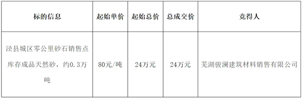 近日,安徽省宣城市涇縣城區零公里砂石銷售點庫存成品天然砂被蕪湖駿瀾建筑材料銷售有限公司成功競得。該批天然砂資源量約0.3萬噸,總成交價24萬元,成交單價80元/噸。