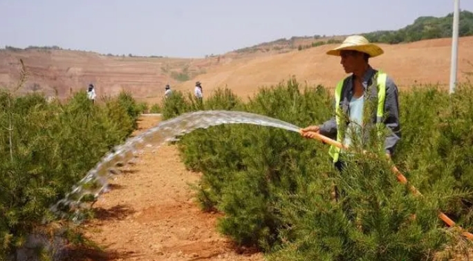 三門峽市澠池縣高橋礦山生態修復治理區內,工人為白皮松澆水。