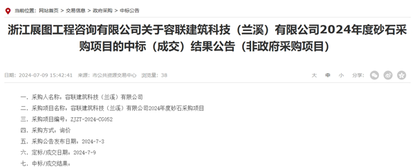 日前,浙江省蘭溪市慶騰建材有限公司中標(biāo)當(dāng)?shù)貒?guó)企子公司容聯(lián)建筑科技(蘭溪)有限公司2024年度砂石采購(gòu)項(xiàng)目(非政府采購(gòu)項(xiàng)目)。
