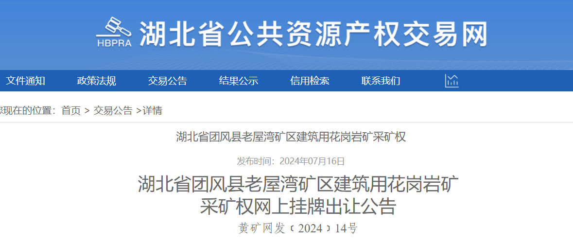 近日,湖北省團風縣老屋灣礦區建筑用花崗巖礦采礦權掛牌出讓,其開采礦種包含建筑用花崗巖、建筑用角閃巖、建設用砂(風化混合花崗巖),儲量共1.04億噸,生產規模500萬噸/年,出讓年限18.2年(含基建期1年),起始價1.73億元,拍賣單價約為1.66元/噸。