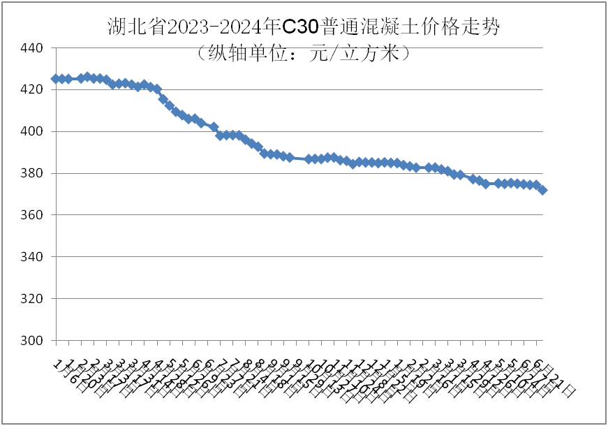 監(jiān)測(cè)數(shù)據(jù)顯示:6月份,強(qiáng)度等級(jí)C30普通混凝土全省均價(jià)為373.87元/立方米,環(huán)比下跌0.33%,同比下跌7.58%。