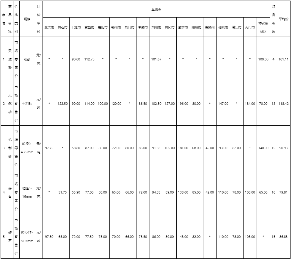 近日,湖北省發(fā)改委發(fā)布了6月份湖北市場(chǎng)的砂石價(jià)格情況。數(shù)據(jù)顯示,6月份湖北市場(chǎng)的砂石價(jià)格整體呈現(xiàn)穩(wěn)中有降的趨勢(shì)。其中,天然砂(中粗砂)和碎石(17-31.5mm)價(jià)格略有下降,而機(jī)制砂和碎石(粒徑5-16mm)的價(jià)格則小幅上漲??傮w來(lái)看,這4類砂石骨料產(chǎn)品的價(jià)格變動(dòng)并不顯著,也基本維持在上月的水平。這種價(jià)格穩(wěn)定性進(jìn)一步印證了湖北省當(dāng)前砂石市場(chǎng)供需關(guān)系的平衡狀態(tài)。