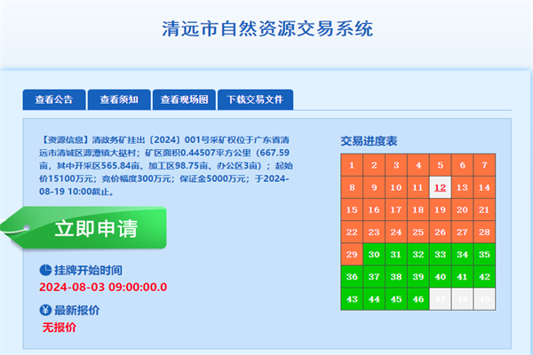 該礦權名稱為珍珠塘建筑用花崗巖礦,位于廣東省清遠市清城區源潭鎮大撻村,可采建筑用花崗巖儲量1094.8萬方、砂質高嶺土24.02萬方、半風化花崗巖312.62萬方、半風化矽卡巖28.49萬方、全風化花崗巖250.85萬方、殘坡積土65.34萬方、全風化矽卡巖35.09萬方。年生產規模100萬方,出讓年限14年(含基建期、復墾治理期),起始價1.51億元。