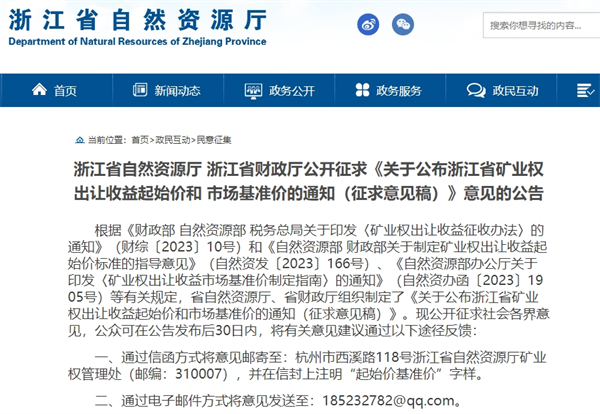 近日,浙江省自然資源廳、財政廳發布《關于公布浙江省礦業權出讓收益起始價和市場基準價的通知(征求意見稿)》。