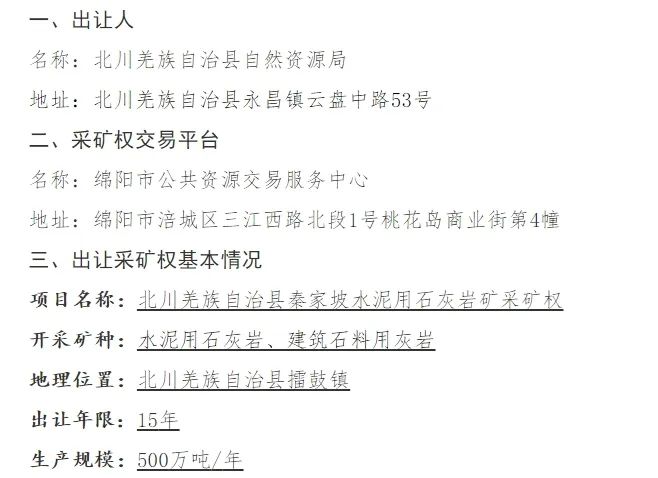 近日,四川綿陽市北川羌族自治縣自然資源局拍賣出讓資源量7558萬噸、年產500萬噸,出讓年限15年的砂石類采礦權。