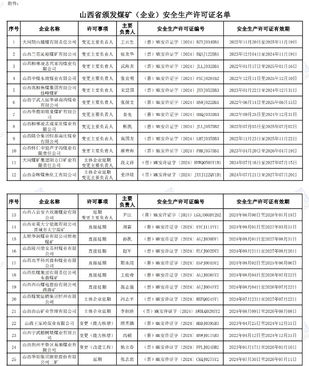 經研究,按照有關規定,為大同鵲山精煤有限責任公司等 25 座煤礦(企業)頒發安全生產許可證,現進行公告。 公告期:2024 年 7 月 27 日至2024 年8 月2 日。