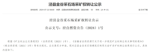 日前,安徽省宣城市涇縣金谷采石場成功轉(zhuǎn)讓,轉(zhuǎn)讓價(jià)格為453.16萬元。當(dāng)?shù)孛駹I企業(yè)安徽金榮礦業(yè)有限公司成為該采石場的“新主人”。截止目前,該采石場還擁有74.萬噸建筑石料用灰?guī)r,經(jīng)計(jì)算,此次轉(zhuǎn)讓資源成本約為6.12元/噸。