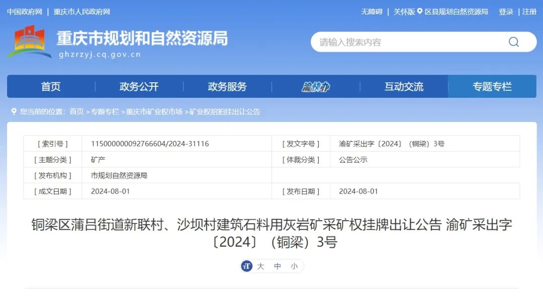 8月1日,重慶市銅梁自然資源局發布銅梁區蒲呂街道新聯村、沙壩村建筑石料用灰巖礦掛牌出讓公告。該項目資源儲量6582.7萬噸,擬建設生產規模500萬噸/年,出讓年限12年,起始價約2.12億元。除競得價款外,還須支付土地租用、建構筑物搬遷補償等費用約3億元。經計算,該項目噸成本約7.8元。