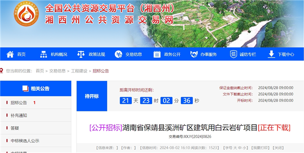 8月2日,湖南省湘西州公共資源交易網(wǎng)發(fā)布保靖縣溪洲礦區(qū)建筑用白云巖礦項(xiàng)目設(shè)計(jì)施工總承包(EPC)招標(biāo)公告,投標(biāo)截止時(shí)間為2024年8月28日9時(shí),接受聯(lián)合體投標(biāo)。招標(biāo)人為湖南建投砂石產(chǎn)業(yè)保靖有限公司,工期要求300日歷天,最高投標(biāo)限價(jià)7581萬元。