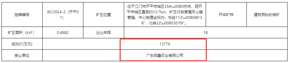 近日,廣東省開平市月山鎮北二牛山礦區建筑用粉砂巖礦采礦權被廣東招鑫石業有限公司以底價13776萬元競得。該項目開采總儲量4513.8萬方,年生產規模200萬方,出讓年限18年。競得人另需支付土地租金等費用約4428萬元。經計算,該礦折合方成本約4元/方。