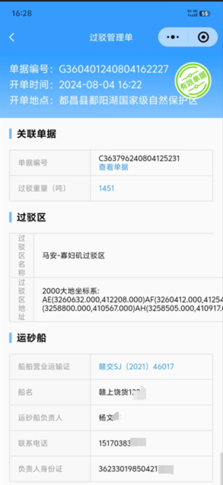 8月4日下午,九江市拓新建材有限公司首份鄱陽湖水域砂石電子過駁單順利開具。砂石電子過駁單的開具實現了鄱陽湖區河道砂石轉載、過駁環節的有效管控。