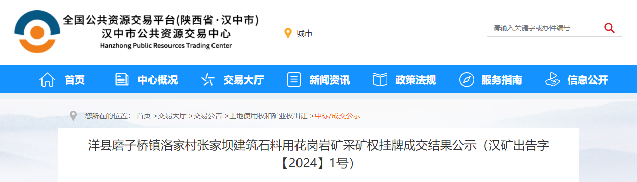 近日,陜西洋縣磨子橋鎮洛家村張家壩建筑石料用花崗巖礦被洋縣正德礦業有限公司以8820萬元成功競得。該礦資源儲量10705.58萬噸,生產規模年產445.4萬噸,擬出讓19.23年。