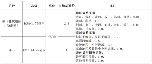 據意見稿顯示,河道砂石礦業權出讓收益=市場基準價×地區調整系數×流域調整系數×采砂類型調整系數。其中,粒徑<4.75毫米的砂(建筑用砂、粉細砂)市場基準價為2.3元/噸,粒徑≥4.75毫米的卵石市場基準價為1元/噸。