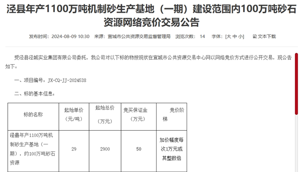 8月9日,安徽省宣城市公共資源交易監督管理局發布公告稱,涇縣年產1100萬噸機制砂生產基地(一期)建設范圍內100萬噸砂石資源以網絡競價方式進行公開交易。標的起拍單價為29元/噸,起拍總價2900萬元,保證金50萬元。