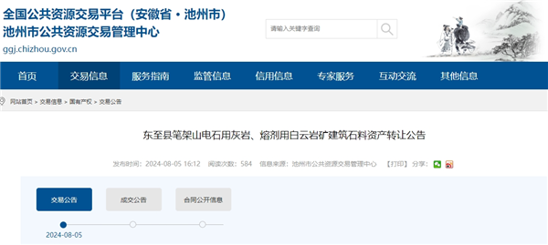 日前,安徽省池州市公共資源交易管理中心發(fā)布東至縣筆架山電石用灰?guī)r、熔劑用白云巖礦建筑石料資產(chǎn)轉(zhuǎn)讓公告,掛牌截止日期為2024年8月30日。本次轉(zhuǎn)讓標(biāo)的系所在礦山正常開采經(jīng)營(yíng)過(guò)程中產(chǎn)生的建筑石料,總量為1404.68萬(wàn)噸,轉(zhuǎn)讓底價(jià)4460萬(wàn)元,折合每噸3.17元。