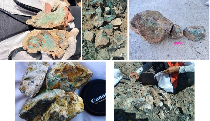 “新疆準噶爾東北緣成礦帶北塔山-大紅柳峽一帶銅金鈷戰略性礦產調查評價”三級項目,由自然資源部“深部礦產資源探測與評價創新團隊”礦產探測部王召林正高級工程師負責。通過工作,該項目在新疆東準噶爾一帶礦業權空白區新發現銅金多金屬礦點8處、鉻鐵礦點1處、赤(磁)鐵礦點1處。其中1處銅(金)多金屬礦帶走向近東西向,初步控制礦帶長約400米,寬約20米,帶內見大量孔雀石、石英褐鐵礦化及原生黃銅礦,快速分析儀顯示新鮮面銅普遍大于5%(孔雀石化處銅大于70%),同時有金、鉛、鋅顯示。另一處銅金多金屬礦帶走向280度,斷續長近600米,寬10-20米不等,帶內發現多處硅化銅鉛礦體,主要為孔雀石、黃銅礦及方鉛礦,目估銅品位大于5%。另外幾處銅礦點經地表取樣也發現塊狀富銅礦體,目估化學樣品位銅大于5%。