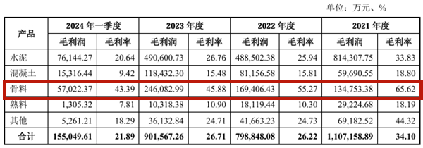 骨料業(yè)務(wù)方面,最近三年及一期(2021年-2024年一季度),華新水泥的骨料業(yè)務(wù)毛利潤分別為13.48億元、16.94億元、24.61億元和5.7億元;毛利率分別為65.62%、55.27%、45.88%、以及43.39%。