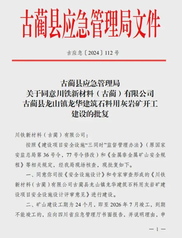 近日,四川省屬國企蜀道鐵路投資集團(tuán)所屬新材料(古藺)公司成功取得龍華建筑石料用石灰?guī)r礦開工建設(shè)批復(fù),項(xiàng)目建設(shè)工期為24個月。