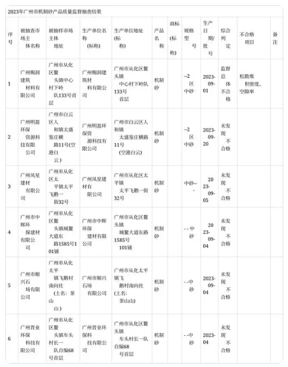 2023年第4季度,廣州市市場監督管理局對機制砂產品質量進行了監督抽查,共抽查了6批次樣品,經檢驗,有1批次產品不符合標準要求。