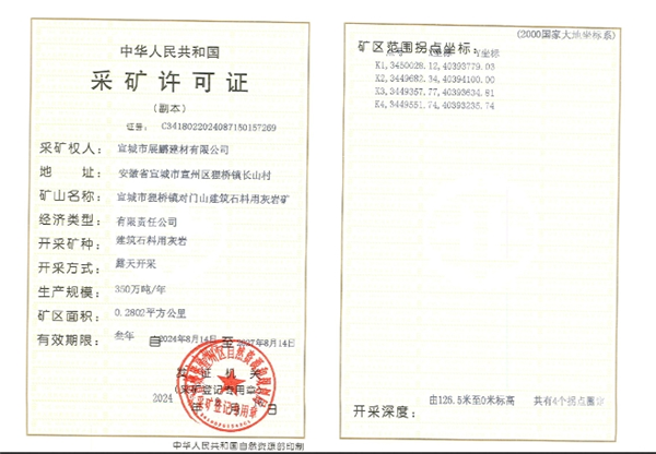 此次礦區出讓的資源儲量為3750.54萬噸(包含原采礦權剩余資源量70.02萬噸,本次新增資源量3680.52萬噸)。其中,建筑石料用灰巖礦探明資源量616.28萬噸、控制資源量1580.12萬噸、推斷資源量580.58萬噸;建筑用花崗巖礦探明資源量276.67萬噸、控制資源量452.4萬噸、推斷資源量244.48萬噸。 宣城市展鵬建材有限公司成立于2010年,位于安徽省宣城市,是一家以從事非金屬礦采選業為主的民營企業。經營范圍為礦產資源開采、建筑用石加工、生態恢復及生態保護服務、花卉種植、林業產品銷售。