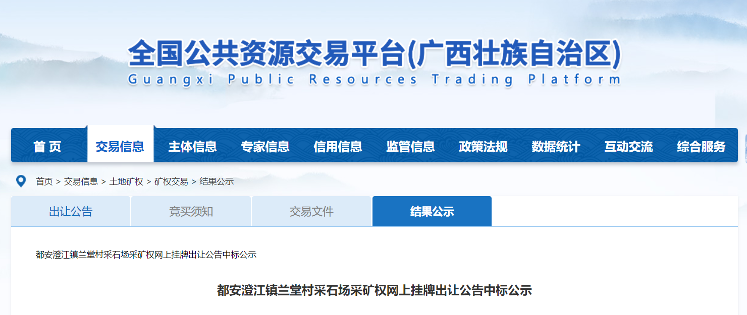 近日,廣西河池市都安澄江鎮蘭堂村采石場采礦權被廣西元景材料科技有限公司以3985萬元競得。擬設礦區范圍設計開采資源量為3514.05萬噸,生產規模300萬噸/年,出讓年限12年,單價約為1.13元/噸。