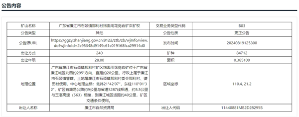 根據公告,該采礦權出讓收益可分期繳納,首期繳納20%,剩余部分在15年內按年度分期均攤繳清。掛牌時間2024年9月14日-2024年9月29日。
