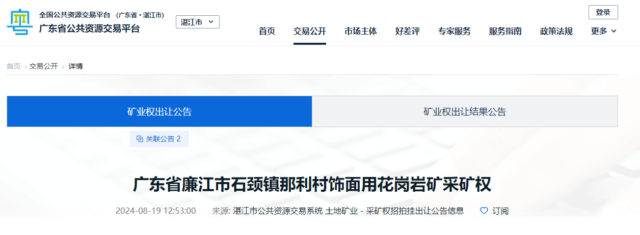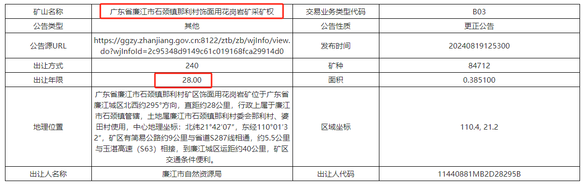 據了解,本次掛牌出讓采礦權,屬非“凈礦”出讓。礦區范圍內曾存在廣東中匯石材有限公司石頸那利高嶺飾面用花崗巖礦,根據廣東中匯石材有限公司提交的采礦權注銷登記申請,廉江市自然資源局已于2024年7月26日準予注銷。競得人需支付原采礦人所持部分資產市場價值為1118.96萬元。