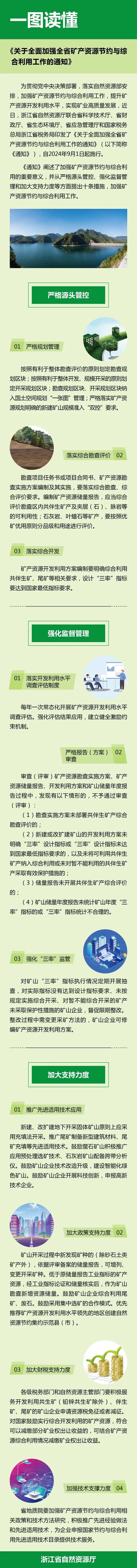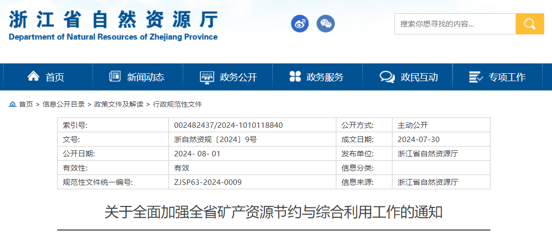 近日,浙江省自然資源廳聯合省科學技術廳、省財政廳、省生態環境廳、省應急管理廳和浙江省稅務局等制定出臺了《關于全面加強全省礦產資源節約與綜合利用工作的通知》(浙自然資規〔2024〕9號,以下簡稱《通知》),《通知》提出強調新建礦山最小資源儲量規模和最低開采規模的雙控要求。從開采環節,規定礦產資源開發利用方案編制要明確綜合利用共伴生礦、尾礦等相關要求,設計“三率”(開采回采率、選礦回收率和綜合利用率)指標要達到國家最低指標要求。