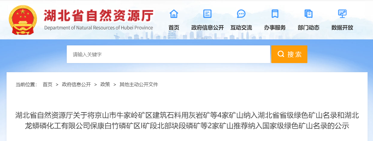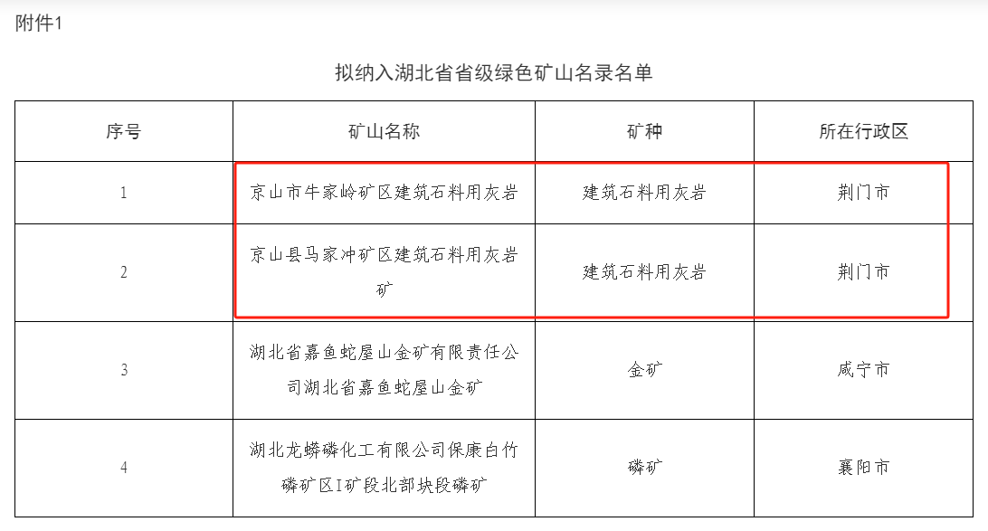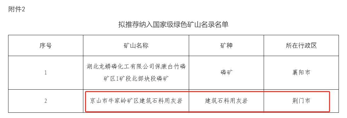近日,湖北省自然資源廳根據自然資源部等七部門《關于進一步加強綠色礦山建設的通知》(自然資規〔2024〕1號)文件要求,經礦山企業自評、縣級和市級自然資源管理部門審核、省廳組織第三方機構遴選評估、征求各相關部門意見,擬將京山市牛家嶺礦區建筑石料用灰巖礦和京山縣馬家沖礦區建筑石料用灰巖礦等2家砂石礦山納入省級綠色礦山名錄。其中京山市牛家嶺礦區建筑石料用灰巖礦山推薦納入國家級綠色礦山名錄。