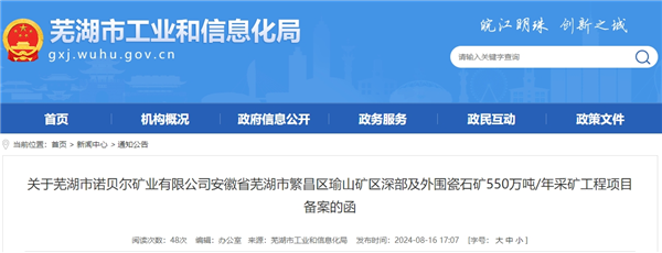 近日,安徽省蕪湖市工業和信息化局發布繁昌區瑜山礦區深部及外圍瓷石礦550萬噸/年采礦工程項目備案的函。據悉,該項目為新建項目,估算總投資近6.2億元,資源量共超1.6億噸(建筑用石料礦資源儲量7101.69萬噸)。 該項目位于蕪湖市繁昌區新港鎮,礦區面積1.145平方千米,擬出讓年限30年(含基建期2年)。2024年4月28日,蕪湖市諾貝爾礦業有限公司以2.48億元競得該項目礦權,其中建筑用石料礦成交價近2.43億元。