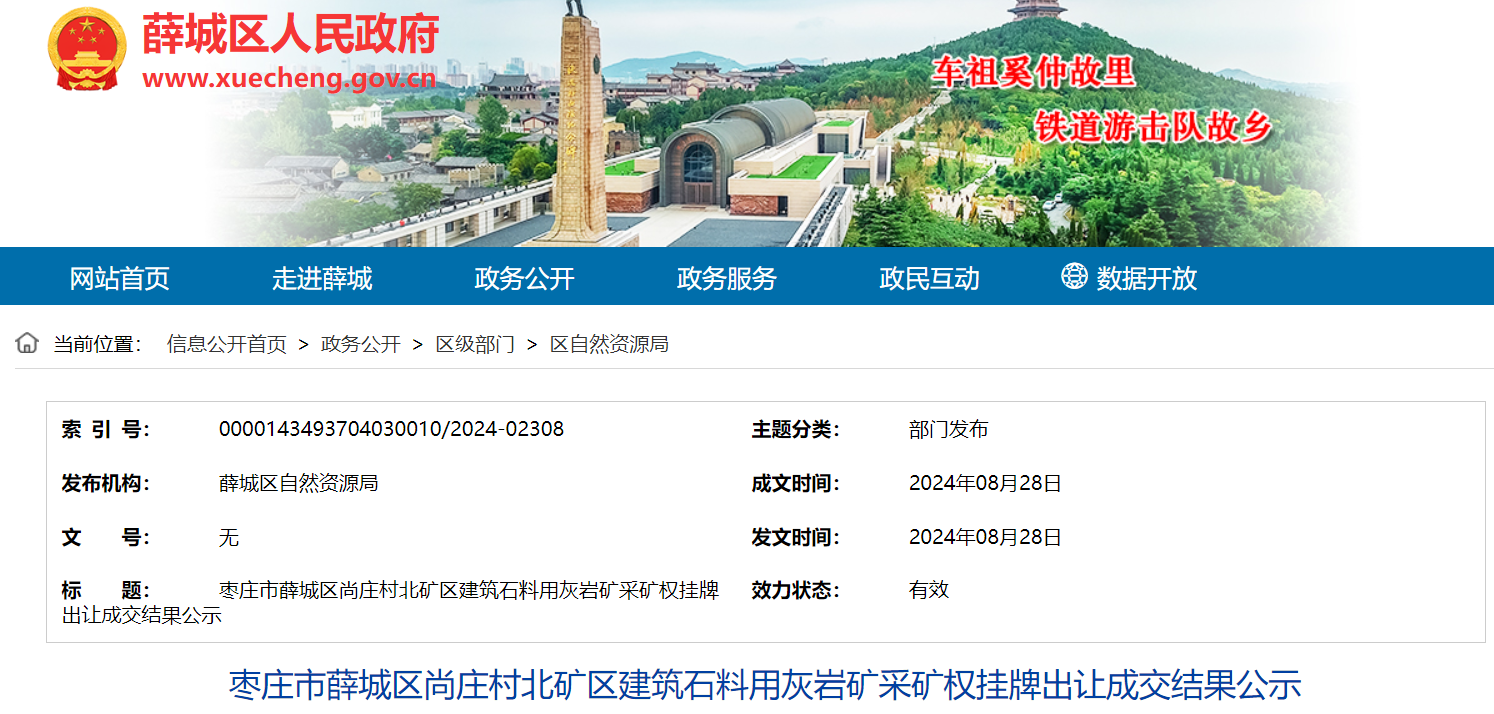 近日,棗莊眾潤新型建筑材料有限公司以底價21710萬元競得棗莊市薛城區尚莊村北礦區建筑石料用灰巖礦。該礦資源儲量5089.91萬噸,生產規模為400萬噸/年,擬出讓年限12.72年。
