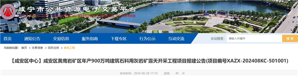 8月28日,湖北省咸寧市公共資源電子交易平臺(tái)發(fā)布咸安區(qū)黃鷹巖礦區(qū)年產(chǎn)900萬(wàn)噸建筑石料用灰?guī)r礦露天開(kāi)采工程報(bào)建公告,或?qū)⑦M(jìn)行公開(kāi)招標(biāo)。