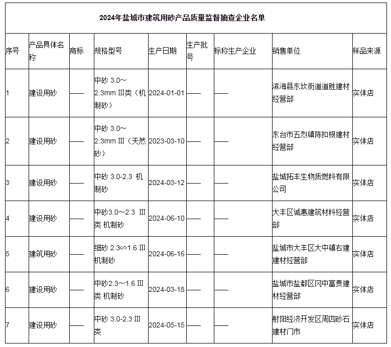 其中,2024年鹽城市市場監督管理局委托鹽城市質量技術監督綜合檢驗檢測中心組織實施建筑用砂產品市級監督抽查。本次抽查計劃7批次,抽到7批次,經檢驗未發現不合格。