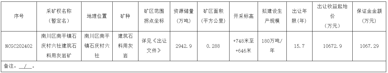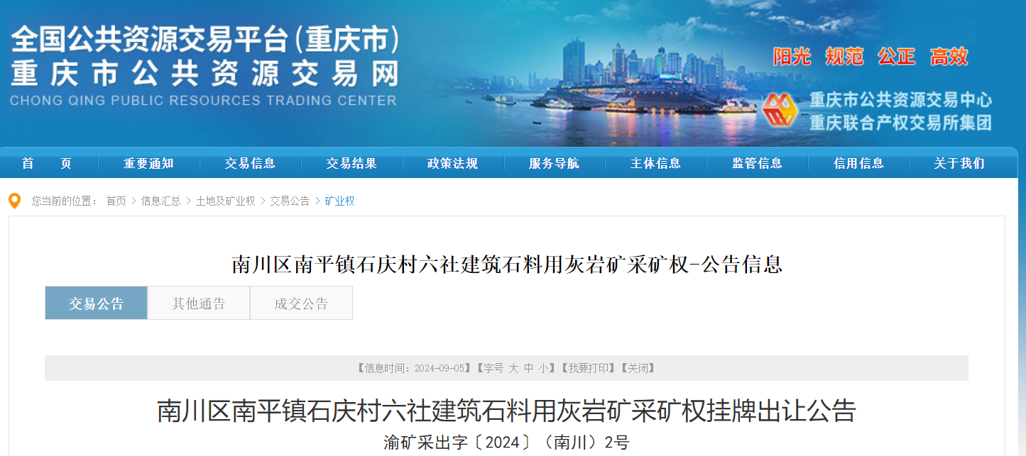 近日,重慶市南川區規劃和自然資源局決定公開掛牌出讓南平鎮石慶村六社建筑石料用灰巖礦采礦權,該礦資源儲量2942.9萬噸,年產180萬噸,出讓年限15.7年,出讓收益起始價10672.9萬元,單價3.62元/噸。