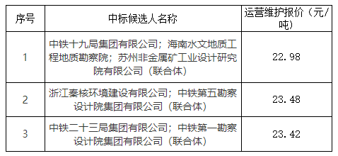 該項(xiàng)目資源儲(chǔ)量4991.5萬(wàn)方,設(shè)計(jì)產(chǎn)能675萬(wàn)噸/年,中鐵十九局集團(tuán)、海南水文地質(zhì)工程地質(zhì)勘察院、蘇州中材非金屬礦工業(yè)設(shè)計(jì)研究院(聯(lián)合體)運(yùn)營(yíng)維護(hù)報(bào)價(jià)22.98元/噸入選,位于候選人第一。