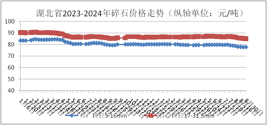 監(jiān)測數(shù)據(jù)顯示:8月份,碎石(粒徑5-16mm)、碎石(粒徑17-31.5mm)全省均價分別為77.97元/噸、85.54元/噸,環(huán)比分別下跌:1.80%、1.37%;同比分別下跌:3.15%、0.81%。具體價格走勢情況如下圖: