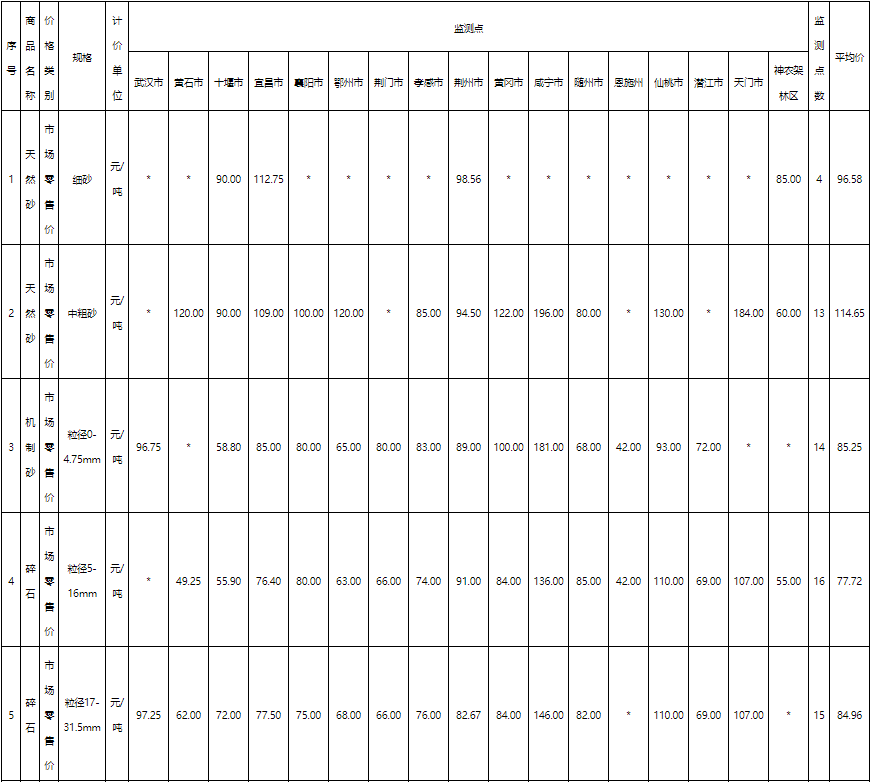 湖北省天然砂(中粗砂):價格最高為天門市184元/噸,價格最低神農(nóng)架林區(qū)60元/噸;