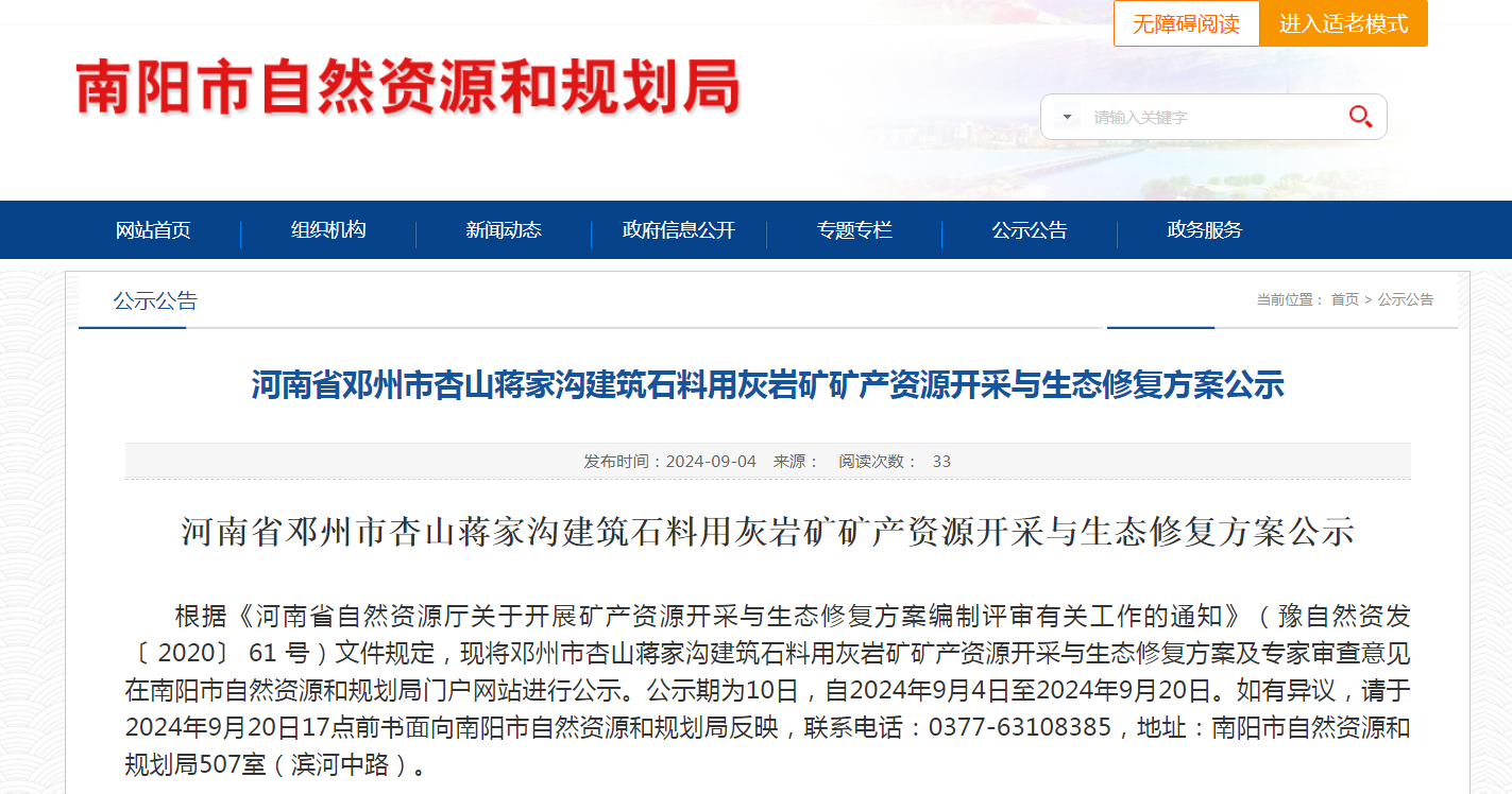 2024年9月4日,南陽市自然資源和規劃局發布《河南省鄧州市杏山蔣家溝建筑石料用灰巖礦礦產資源開采與生態修復方案公示》,將鄧州市杏山蔣家溝建筑石料用灰巖礦礦產資源開采與生態修復方案及專家審查意見進行公示,公示表明,經專家評審,《方案》符合礦產資源開采與生態修復的有關規定、規范和標準,同意評審通過。