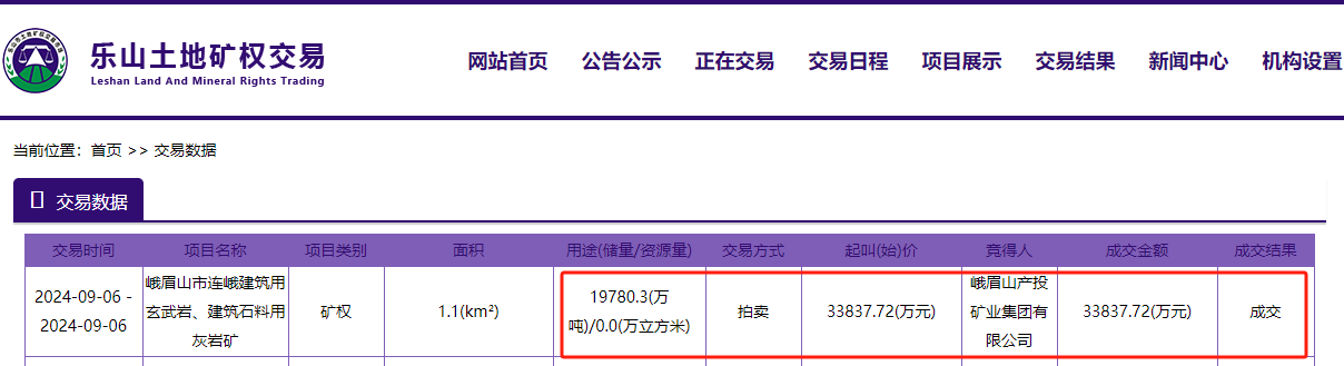 據悉,四川省峨眉山市連峨建筑用玄武巖、建筑石料用灰巖礦采礦權被峨眉山產投礦業集團有限公司以底價33837.72萬元拍得。該礦資源儲量7272.3萬方(近2億噸),生產規模220萬方/年,出讓年限30年,折合資源價款4.65元/方(1.71元/噸)。