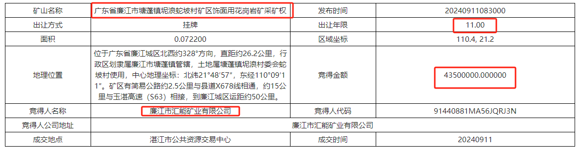 5、廣東省廉江市塘蓬鎮坭浪蛇坡村礦區飾面用花崗巖礦采礦權被廉江市匯能礦業有限公司以4350萬元競得。