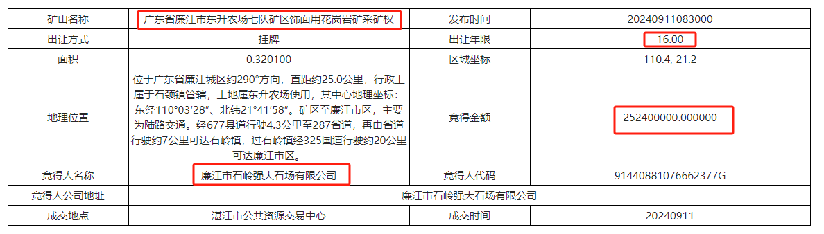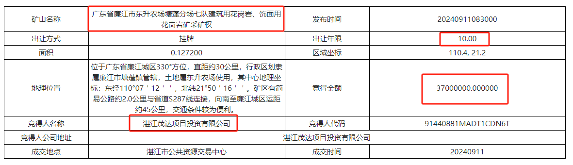 4、廣東省廉江市東升農場塘蓬分場七隊建筑用花崗巖、飾面用花崗巖礦采礦權被湛江茂達項目投資有限公司以3700萬元競得。