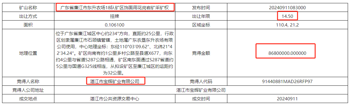 2、廣東省廉江市東升農場18隊礦區飾面用花崗巖礦采礦權被湛江市寶輝礦業有限公司以8680萬元競得。