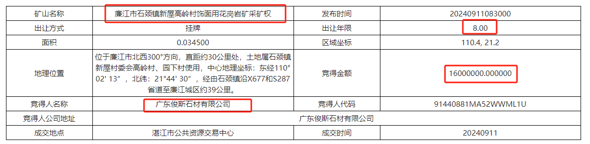 6、廉江市石頸鎮新屋高嶺村飾面用花崗巖礦采礦權被廣東俊斯石材有限公司以1600萬元競得。