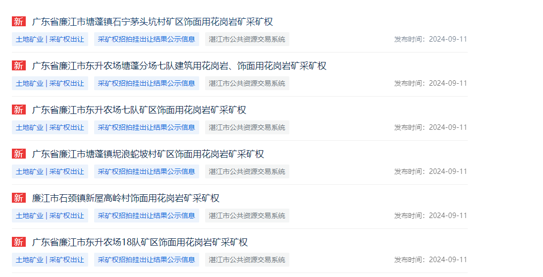 近日,廣東省湛江市公共資源交易中心發布六宗花崗巖礦采礦權出讓結果,六宗花崗巖礦山資源量共計超3670萬方,成交額超51470萬元。其中廣東省廉江市東升農場七隊礦區飾面用花崗巖礦采礦權被廉江市石嶺強大石場有限公司以2.542億元競得,是六宗礦權中最大的一宗。